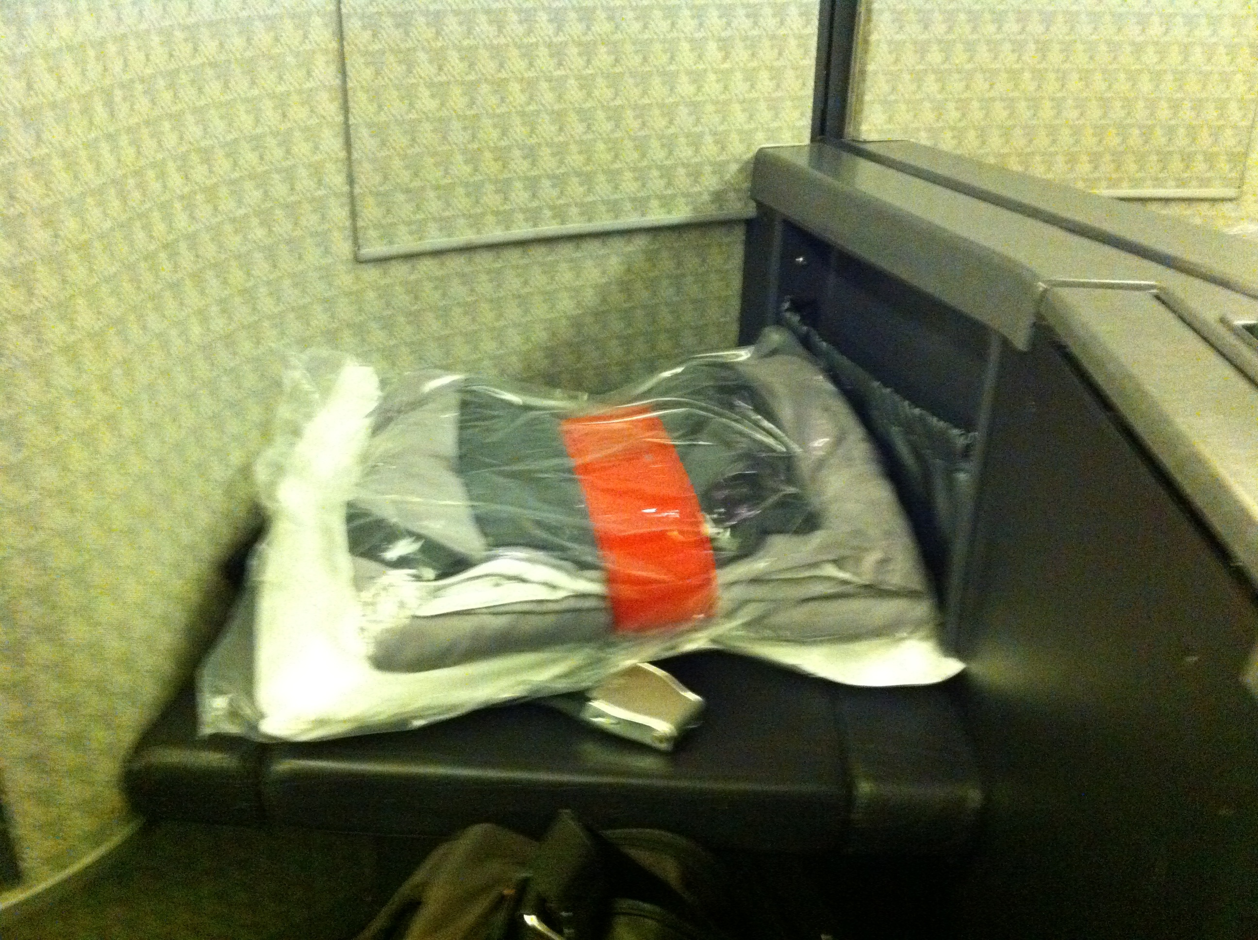 #3: The complimentary accessories (a) bed linens including a padded bed cover, comforter, light blanket, and pillow (b) Bose headset (can’t keep that), slippers, and a bag of toiletries (can keep that) that included lip stuff, lotions, socks, eye mask, toothbrush, and toothpaste.