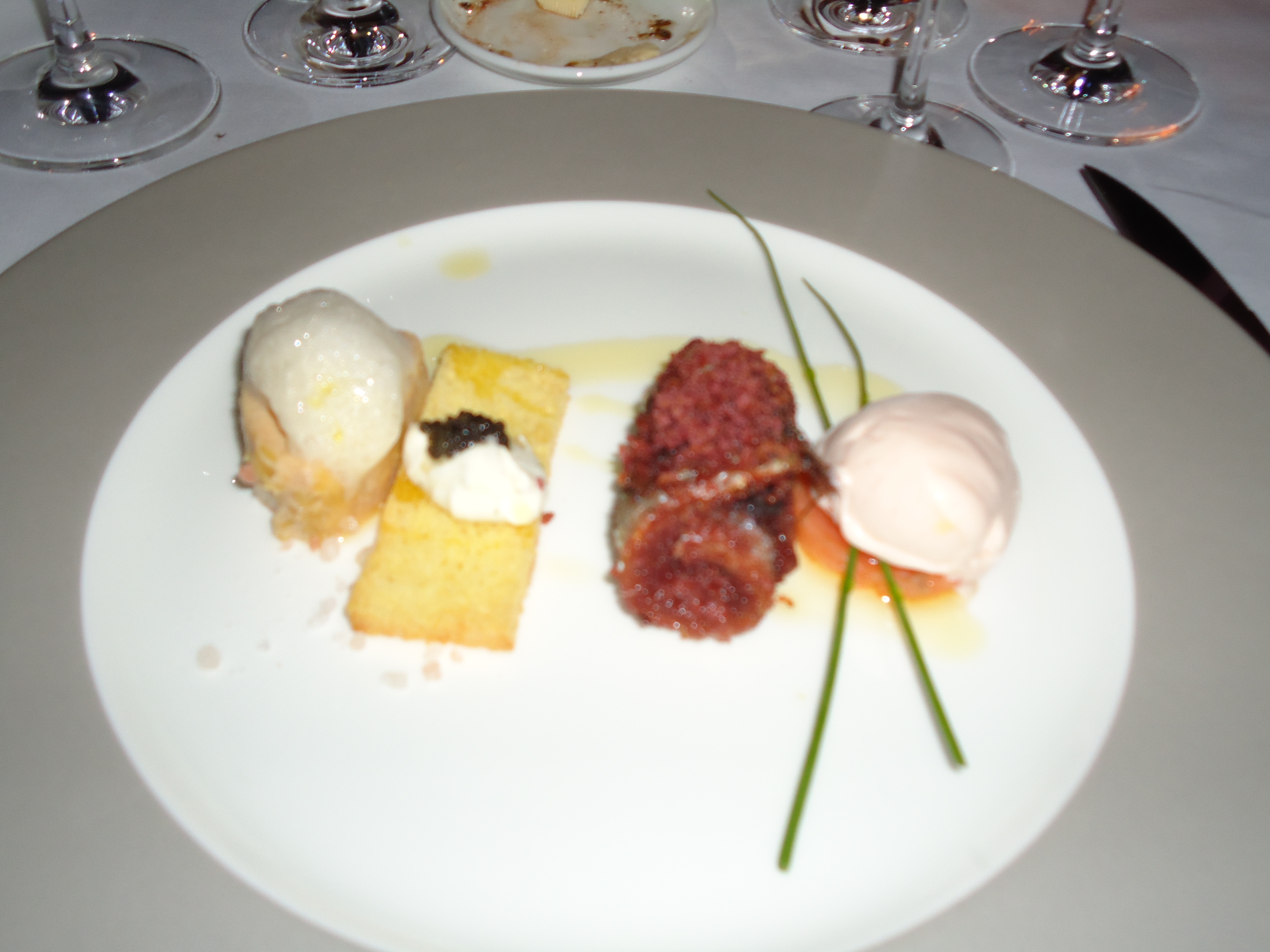 Foie gras with pink salt, brioche and black caviar, roll of fresh anchovies flavored with Malbec wine bread, smoked salmon ice cream