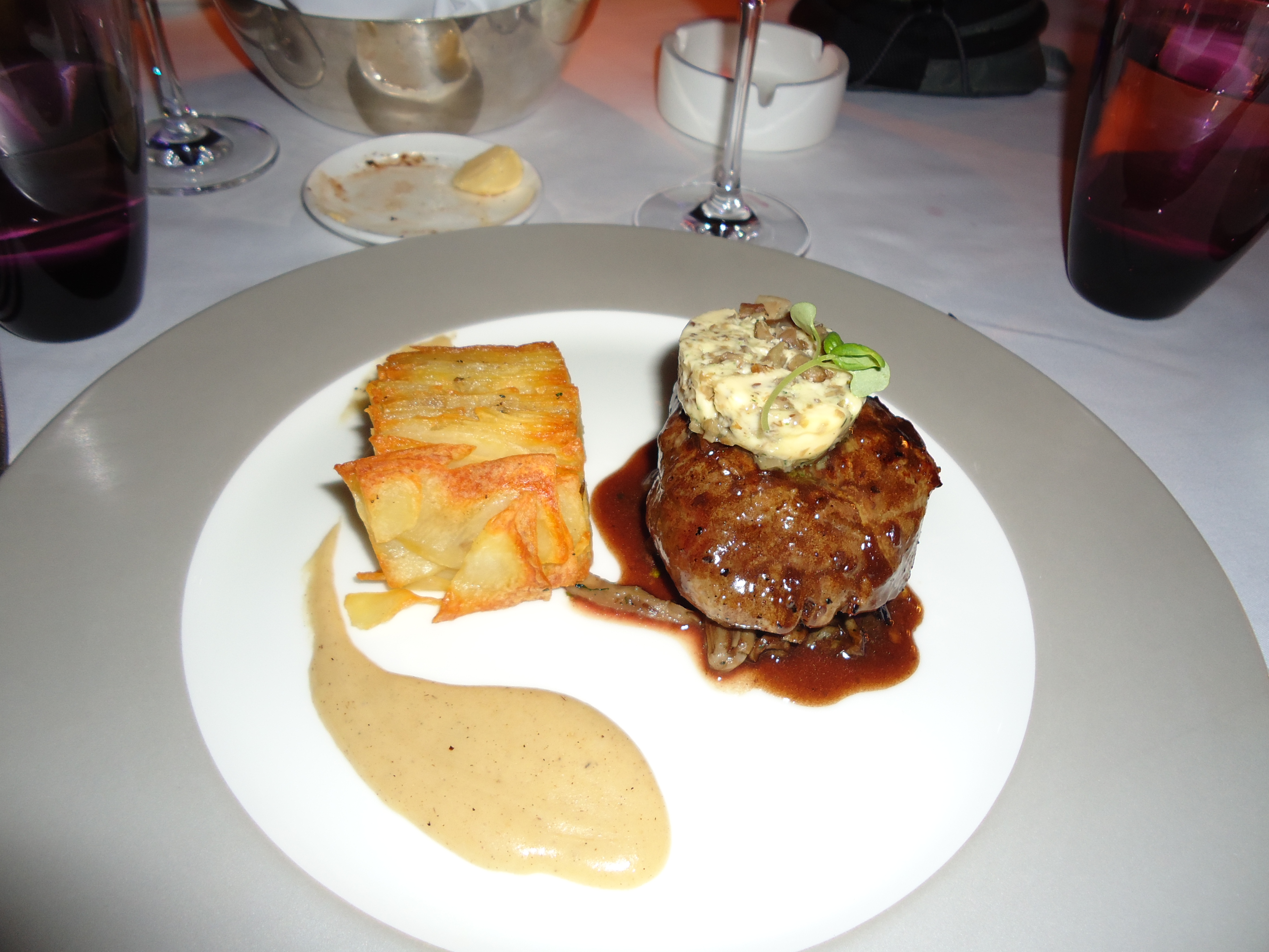 Grilled Dry aged beef tenderloin with black truffle and oyster mushroom butter. Roasted garlic and leek cream. Potato terrine.