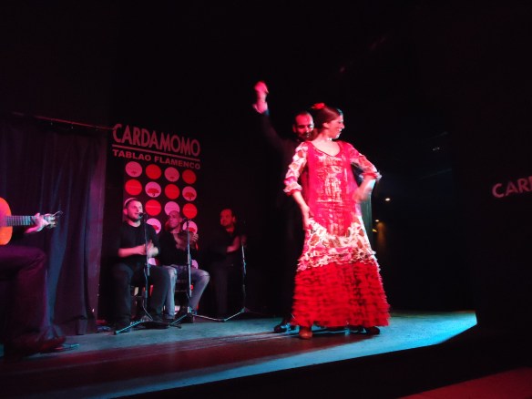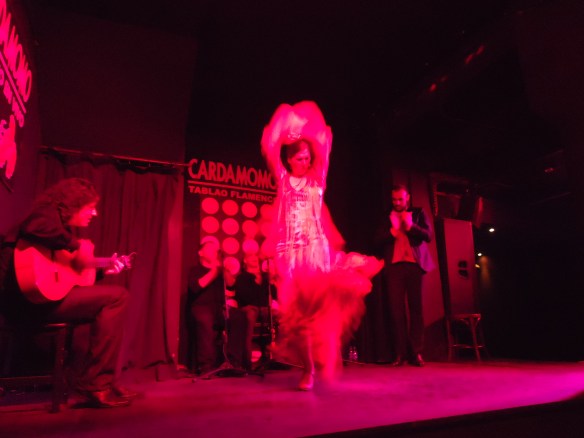We headed back to the hotel for some downtime before the flamenco show at 10 pm. The show was at a club called Cardomomo. It wasn’t a typical flashy flamenco show but, rather, a “working-class” tablao flamenco show. We had first row seats in a tiny club two blocks from our hotel. It reminded me of The Conservatory. There were only about 20 people in the audience.